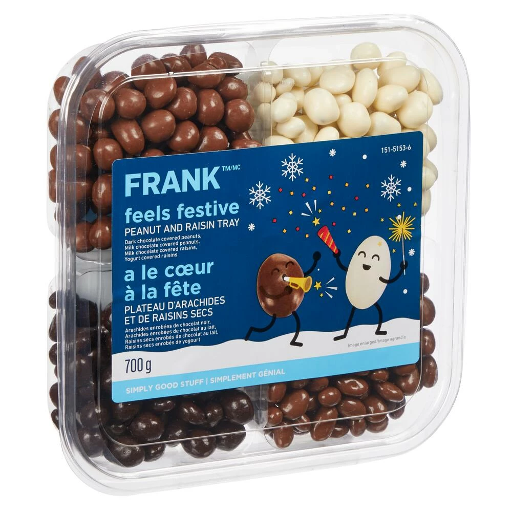 - FRANK Yogurt Raisins & Chocolate Peanuts is great for holiday entertaining and sharing with family