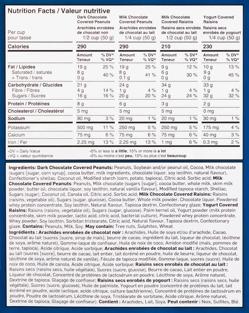 - Seasonal party 4-pocket tray includes dark chocolate, peanuts, milk chocolate, milk chocolate covered raisins and yogurt covered raisins
