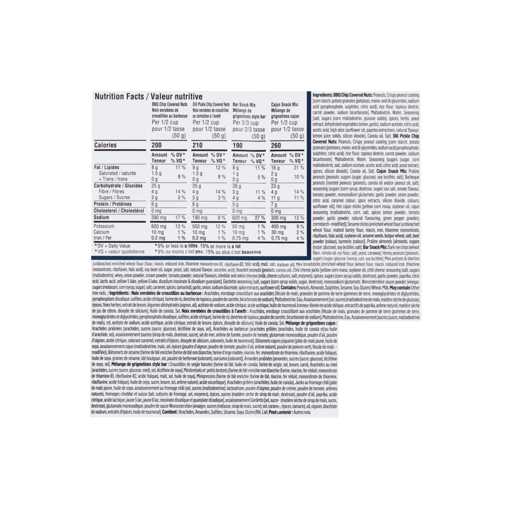 - Contains cajun snack mix, original bar mix, BBQ flavour and Dill flavour chip covered nuts